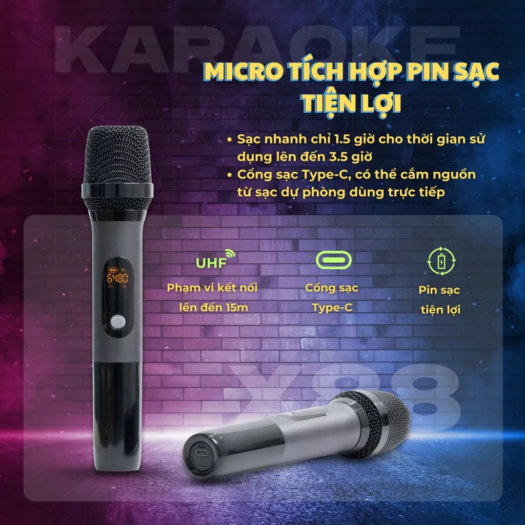 Micro kèm theo | 2 micro không dây UHF (pin sạc 500mAh) |