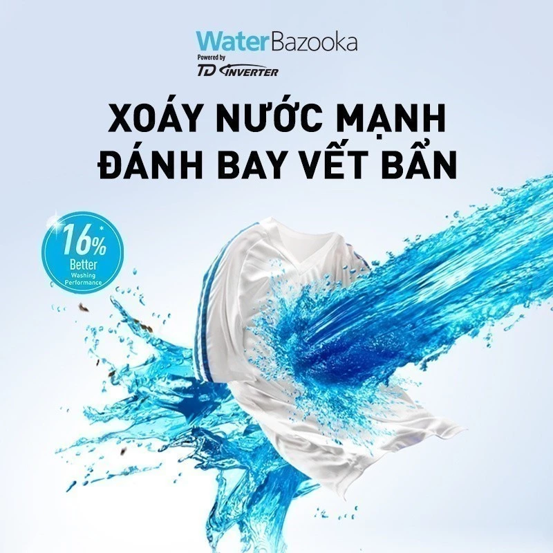 Kết hợp cùng luồng nước xoáy Water Bazooka, máy tạo ra áp lực nước mạnh mẽ, cuốn trôi mọi bụi bẩn chỉ trong một lần giặt.