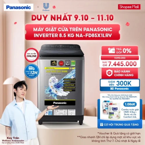 Mang đến trải nghiệm giặt giũ thông minh và tiện lợi, Panasonic Inverter NA-FD85X1LRV là lựa chọn lý tưởng cho gia đình từ 3–5 thành viên. Với thiết kế cửa trên tiện dụng, công nghệ Inverter tiết kiệm điện cùng loạt tính năng chăm sóc vải tối ưu, sản phẩm giúp giặt sạch sâu – bảo vệ quần áo – vận hành êm ái và bền bỉ vượt trội.