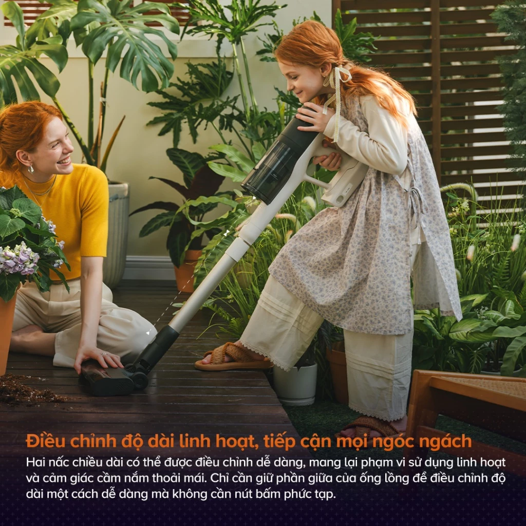 Trang bị động cơ kỹ thuật số thế hệ mới cho lực hút mạnh và ổn định, xử lý hiệu quả bụi mịn, tóc, hạt nhỏ và mảnh vụn trên mọi bề mặt.